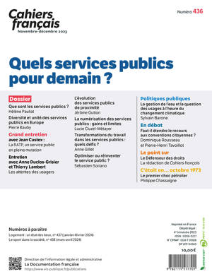 Les services publics restent au cœur du modèle social français. Aux fonctions régaliennes (armée, police, justice), s’ajoutent une multiplicité de missions (santé, transports, éducation etc.) afin d’assurer les conditions d’une certaine égalité entre les citoyens et celles de leur bien-être. Ce dossier met en lumière les atouts et les spécificités du système français, lequel ne connaît pas d’équivalent à l’étranger. Ce numéro de Cahiers français a pour ambition de cerner les difficultés actuelles des services publics. Toutefois, celles-ci ne font pas pour autant oublier les efforts de transformations profondes et de modernisation entrepris depuis une quinzaine d’années pour simplifier et dématérialiser les démarches et les procédures en tirant parti notamment des outils numériques.