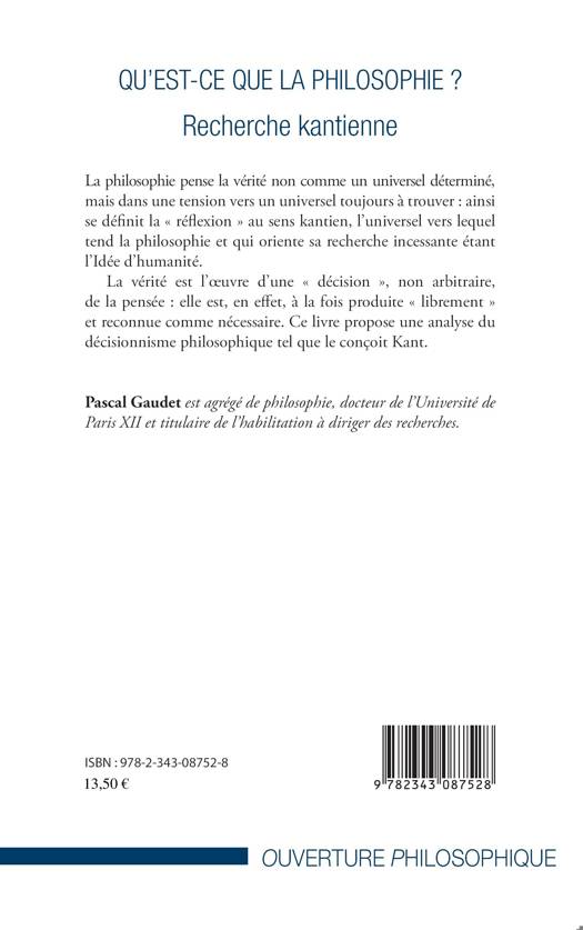 La philosophie pense la vérité non comme un universel déterminé, mais dans une tension vers un universel toujours à trouver : ainsi se définit la « réflexion » au sens kantien, l'universel vers lequel tend la philosophie et qui oriente sa recherche incessante étant l'Idée d'humanité. La vérité est l'uvre d'une « décision », non arbitraire, de la pensée : elle est, en effet, à la fois produite « librement » et reconnue comme nécessaire. Ce livre propose une analyse du décisionnisme philosophique tel que le conçoit Kant.
