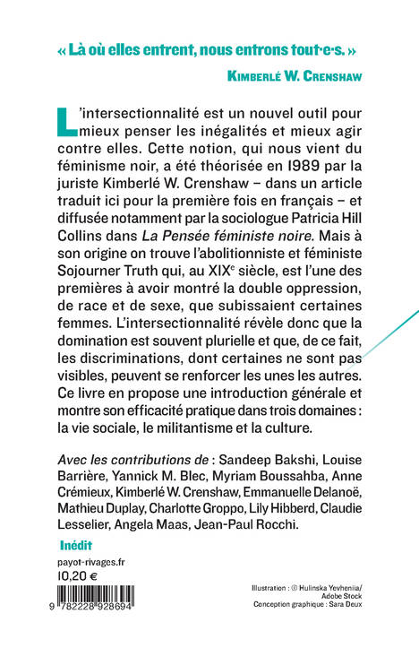 L'intersectionnalité est un nouvel outil pour mieux penser les inégalités et mieux agir contre elles. Cette notion, qui nous vient du féminisme noir, a été théorisée en 1989 par la juriste Kimberlé W. Crenshaw - dans un article traduit ici pour la première fois en français - et diffusée notamment par la sociologue Patricia Hill Collins dans "La Pensée féministe noire". Mais à son origine on trouve l'abolitionniste et féministe Sojourner Truth qui, au XIXe siècle, est l'une des premières à avoir montré la double oppression, de race et de sexe, que subissaient certaines femmes. L'intersectionnalité révèle donc que la domination est souvent plurielle et que, de ce fait, les discriminations, dont certaines ne sont pas visibles, peuvent se renforcer les unes les autres. Ce livre en propose une introduction générale et montre son efficacité pratique dans trois domaines : la vie sociale, le militantisme et la culture.