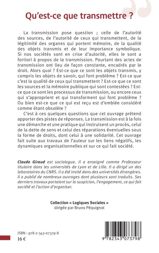 Si nos sociétés sont en crise d'autorité, elles le sont a fortiori à propos de la transmission qui a lieu de façon constante. Est-ce que ce sont les objets transmis qui font problème ? Est-ce que ce sont les processus de transmission, ou encore ceux qui s'approprient et qui transforment qui font problème ? Cet ouvrage prétend ainsi apporter des pistes de réponses et fait suite aux travaux de l'auteur sur les liens négatifs, les dynamiques organisationnelles et sur ce qui fait société.