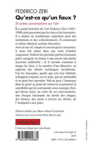 Avec le ton vif, simple et concret qui le caractérise, il nous fait entrer dans une sorte d'atelier imaginaire. Il décrit les procédés parfois étonnants grâce auxquels on donne à une oeuvre une patine ancienne artificielle ; et il raconte comment il traque les faux, à la manière d'un détective, en repérant des détails stylistiques incohérents. Car les faussaires, quelle que soit leur habilité, achoppent toujours sur le style, qui est inimitable et ne peut être reproduit. Nul ne peut s'immerger dans le passé au point de retrouver exactement la sensibilité