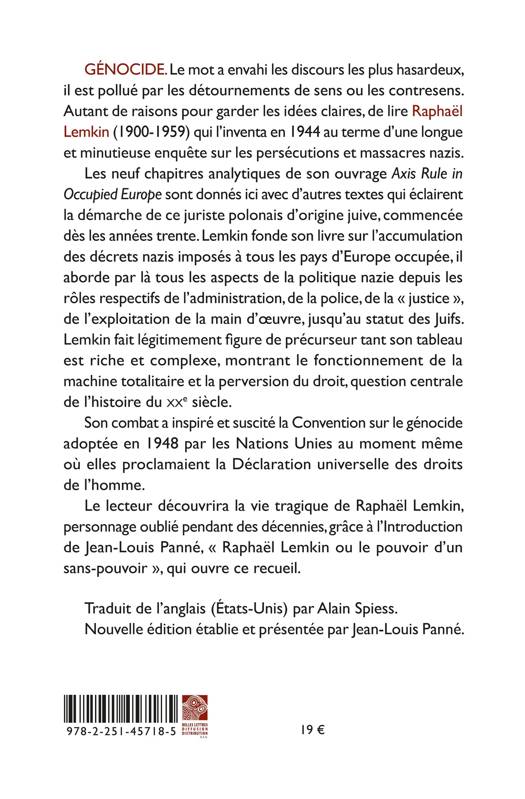 GENOCIDE. Le mot a envahi les discours les plus hasardeux, il est pollue par les detournements de sens ou les contresens. Autant de raisons pour garder les idees claires, de lire Raphael Lemkin (1900-1959) qui l'inventa en 1944 au terme d'une longue et minutieuse enquete sur les persecutions et massacres nazis. Les neuf chapitres analytiques de son ouvrage Axis Rule in Occupied Europe sont donnes ici avec d'autres textes qui eclairent la demarche de ce juriste polonais d'origine juive, commencee des les annees trente. Lemkin fonde son livre sur l'accumulation des decrets nazis imposes a tous les pays d'Europe occupee, il aborde par la tous les aspects de la politique nazie depuis les roles respectifs de l'administration, de la police, de la justice , de l'exploitation de la main d'oeuvre, jusqu'au statut des Juifs. Lemkin fait legitimement figure de precurseur tant son tableau est riche et complexe, montrant le fonctionnement de la machine totalitaire et la perversion du droit, question centrale de l'histoire du XXe siecle. Son combat a inspire et suscite la Convention sur le genocide adoptee en 1948 par les Nations Unies au moment meme ou elles proclamaient la Declaration universelle des droits de l'homme. Le lecteur decouvrira la vie tragique de Raphael Lemkin, personnage oublie pendant des decennies, grace a l'Introduction de Jean-Louis Panne, Raphael Lemkin ou le pouvoir d'un sans-pouvoir , qui ouvre ce recueil.