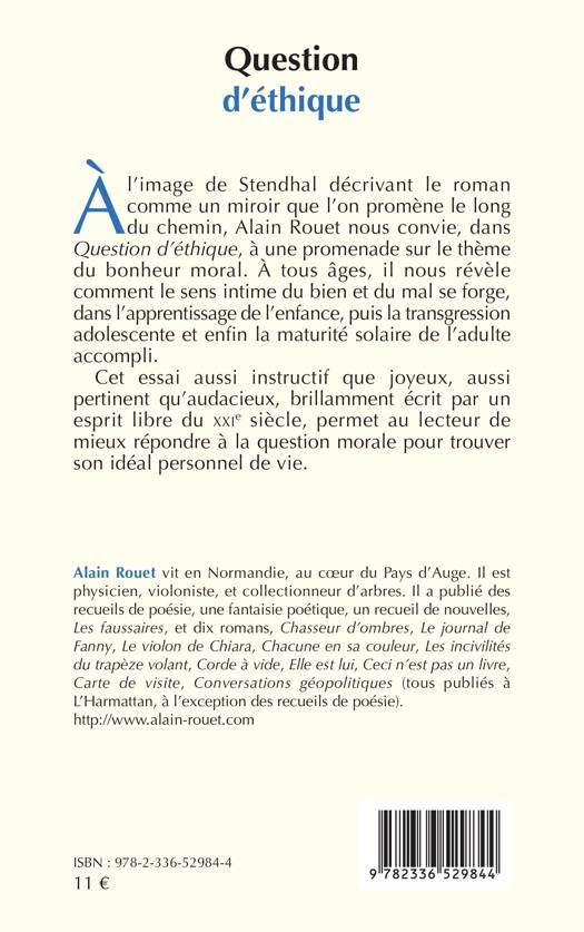 À l'image de Stendhal décrivant le roman comme un miroir que l'on promène le long du chemin, Alain Rouet nous convie, dans Question d'éthique, à une promenade sur le thème du bonheur moral. À tous âges, il nous révèle comment le sens intime du bien et du mal se forge, dans l'apprentissage de l'enfance, puis la transgression adolescente et enfin la maturité solaire de l'adulte accompli. Cet essai aussi instructif que joyeux, aussi pertinent qu'audacieux, brillamment écrit par un esprit libre du XXIe siècle, permet au lecteur de mieux répondre à la question morale pour trouver son idéal personnel de vie.