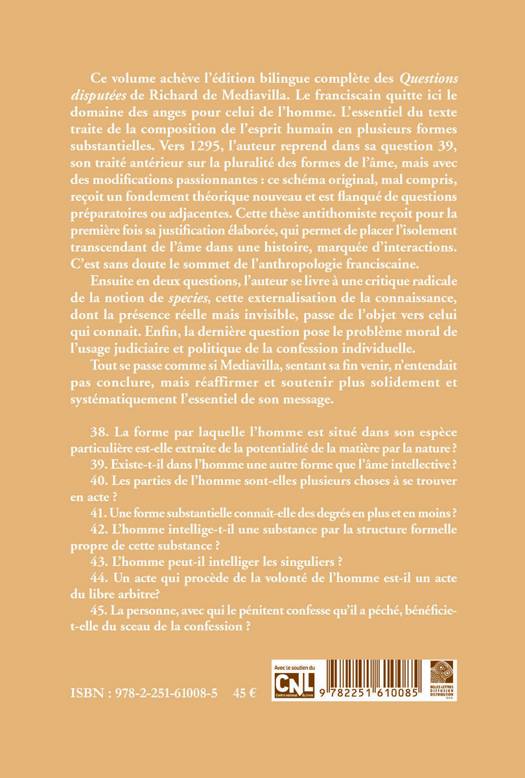 English summary: This bilingual Latin-French edition completes the publication of Richard of Mediavilles corpus of disputations. In this final volume, the medieval Franciscan focuses on the composition of the human mind and spirit in substantial form. Specific texts address the form of the soul, the externalization of knowledge, and the moral problem of the judicial and political use of individual confessions. French description: Ce volume acheve l'edition bilingue complete des Questions disputees de Richard de Mediavilla. Le franciscain quitte ici le domaine des anges pour celui de l'homme. L'essentiel du texte traite de la composition de l'esprit humain en plusieurs formes substantielles. Vers 1295, l'auteur reprend dans sa question 39, son traite anterieur sur la pluralite des formes de l'ame, mais avec des modifications passionnantes: ce schema original, mal compris, recoit un fondement theorique nouveau et est flanque de questions preparatoires ou adjacentes. Cette these antithomiste recoit pour la premiere fois sa justification elaboree, qui permet de placer l'isolement transcendant de l'ame dans une histoire, marquee d'interactions. C'est sans doute le sommet de l'anthropologie franciscaine. Ensuite en deux questions, l'auteur se livre a une critique radicale de la notion de species, cette externalisation de la connaissance, dont la presence reelle mais invisible, passe de l'objet vers celui qui connait. Enfin, la derniere question pose le probleme moral de l'usage judiciaire et politique de la confession individuelle. Tout se passe comme si Mediavilla, sentant sa fin venir, n'entendait pas conclure, mais reaffirmer et soutenir plus solidement et systematiquement l'essentiel de son message. 38. La forme par laquelle l'homme est situe dans son espece particuliere est-elle extraite de la potentialite de la matiere par la nature? 39. Existe-t-il dans l'homme une autre forme que l'ame intellective? 40. Les parties de l'homme sont-elles plusieurs choses a se trouver en acte? 41. Une forme substantielle connait-elle des degres en plus et en moins? 42. L'homme intellige-t-il une substance par la structure formelle propre de cette substance? 43. L'homme peut-il intelliger les singuliers? 44. Un acte qui procede de la volonte de l'homme est-il un acte du libre arbitre? 45. La personne, avec qui le penitent confesse qu'il a peche, beneficiet- elle du sceau de la confession?