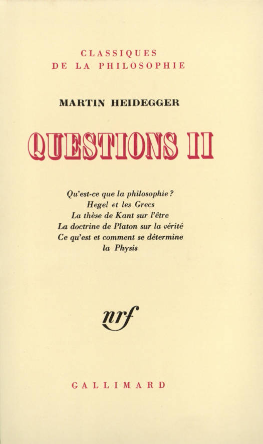 Ce second volume de Questions recueille des textes où Heidegger tente de prendre en vue la philosophie comme la libre succession des diverses philosophies, en deçà de leur enchaînement historique. Une conférence prononcée à Cerisy-la-Salle en 1955, Qu'est-ce que la philosophie ?, ouvre le volume. On trouve ensuite le texte remanié d'une conférence prononcée à Aix-en-Provence le 20 mars 1958, Hegel et les Grecs ; La Thèse kantienne sur l'être, publiée en 1962 ; La Doctrine platonicienne de la Vérité, dont la rédaction définitive a eu lieu en 1940. Ce qu'est et comment se détermine la Phusis ? qui est la rédaction d'un séminaire tenu pendant l'année 1940, et pendant lequel a eu lieu l'une des plus fascinantes lectures du philosophe.
