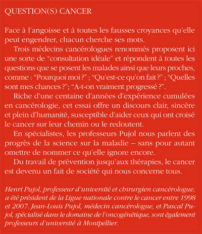 Trois oncologues renommés (le professeur Henri Pujol a été président de la "Ligue national contre le cancer" de 1998 à 2007 ; ses deux fils exercent depuis plus de vingt ans), proposent ici une sorte de "consultation idéale" et répondent aux questions pressantes des personnes atteintes d'un cancer et de leurs proches. Nourri d'une longue expérience et du désir d'instaurer une relation humaine de qualité entre le médecin oncologue et le malade, ce livre dit ce qu'on sait actuellement sur le cancer mais nomme aussi ce qu'on ignore encore.