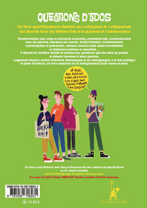 Transformation des corps et émotions nouvelles, premières fois, communication avec les parents, relations aux autres, droits humains, consentement, contraception et prévention, réseaux sociaux mais aussi harcèlement et violences sexistes et sexuelles… il répond de manière simple et précise aux questions que les ados se posent et posent rarement à leurs parents.