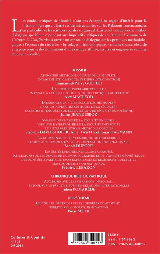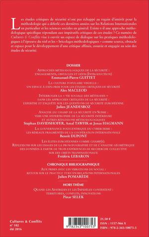 Les études critiques de sécurité n'ont pas échappé au regain d'intérêt pour la méthodologie qui a déferlé ces dernières années sur les Relations Internationales en particulier et les sciences sociales en général. Existe-t-il une approche méthodologique spécifique répondant aux impératifs critiques de ces études ? Ce numéro de Cultures & Conflits vise à ouvrir un espace de dialogue sur les pratiques méthodologiques à l'épreuve du réel et les « bricolages méthodologiques » comme source, obstacle et espace pour le développement d'une critique affinée, assurée et engagée au sein des études de sécurité.