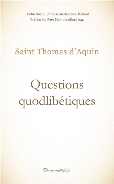 Les questions quodlibétiques (litt. questions sur n'importe quel sujet) de saint Thomas d'Aquin, traduites pour la première fois en français, à partir de l'édition latine de la Commission Léonine, par le professeur Jacques Ménard, relèvent d'un genre littéraire bien connu en milieu universitaire parisien au milieu du XIIIe siècle : Le maître invitait son auditoire à soulever publiquement des questions sur n'importe quel sujet. Inédit de saint Thomas d'Aquin, traduit pour la première fois en français Traduction de Jacques Ménard, professeur d'histoire du Moyen Âge à l'Université de Montréal (Canada). Il a fait partie de l'équipe qui a traduit en français les décrets des conciles Åcuméniques pour les éditions du Cerf. Il a traduit aussi d'autres Åuvres de Thomas d'Aquin publiées aux éditions du Sandre. Préface du Père Maxime Allard o.p., professeur de philosophie et de théologie à Ottawa (Canada), Docteur en théologie de l'Université de Laval C'est un jeu de questions-réponses pouvant se lire dans le désordre selon les besoins de sa recherche, accessible à un large public Nombreuses questions sur la vie religieuse. Diffusion du livre dans les couvents et monastères.