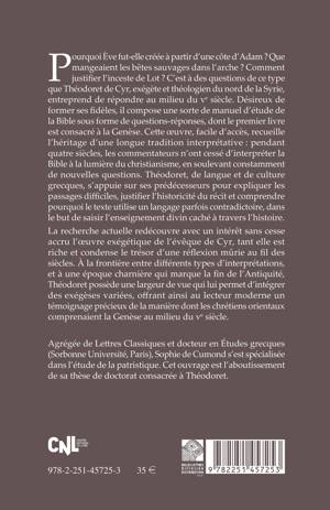 Pourquoi Eve fut-elle creee a partir d'une cote d'Adam ? Que mangeaient les betes sauvages dans l'arche ? Comment justifier l'inceste de Lot ? C'est a des questions de ce type que Theodoret de Cyr, exegete et theologien du nord de la Syrie, entreprend de repondre au milieu du ve siecle. Desireux de former ses fideles, il compose une sorte de manuel d'etude de la Bible sous forme de questions-reponses, dont le premier livre est consacre a la Genese. Cette oeuvre, facile d'acces, recueille l'heritage d'une longue tradition interpretative: pendant quatre siecles, les commentateurs n'ont cesse d'interpreter la Bible a la lumiere du christianisme, en soulevant constamment de nouvelles questions. Theodoret, de langue et de culture grecques, s'appuie sur ses predecesseurs pour expliquer les passages difficiles, justifier l'historicite du recit et comprendre pourquoi le texte utilise un langage parfois contradictoire, dans le but de saisir l'enseignement divin cache a travers l'histoire. La recherche actuelle redecouvre avec un interet sans cesse accru l'oeuvre exegetique de l'eveque de Cyr, tant elle est riche et condense le tresor d'une reflexion murie au fil des siecles. A la frontiere entre differents types d'interpretations, et a une epoque charniere qui marque la fin de l'Antiquite, Theodoret possede une largeur de vue qui lui permet d'integrer des exegeses variees, offrant ainsi au lecteur moderne un temoignage precieux de la maniere dont les chretiens orientaux comprenaient la Genese au milieu du Ve siecle.