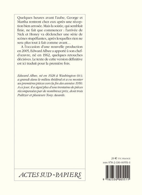 À l'occasion d'une nouvelle production en 2005, Edward Albee a apporté à son chef-d'oeuvre, né en 1962, quelques retouches décisives. Le texte de cette version définitive est ici traduit pour la première fois.