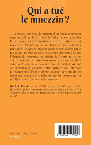 Le roman, sur fond du meurtre d'un muezzin survenu dans un village du fin fond de l'Algérie, met en scène l'émoi d'une société écartelée entre l'archaïsme et la modernité, l'aspiration à la liberté et les pesanteurs politiques. Une grand-mère anxieuse et bouleversée par le fait divers, un prof de dessin qui a une idée bien à lui sur l'identité du meurtrier, un officier de l'armée qui craint que ce meurtre ne nuise à sa carrière, un ancien élève d'une école coranique devenu athée et libertin; autant de personnages peuplent cette histoire qui interroge la religion musulmane, pointe du doigt certains de ses tropismes et porte une réflexion sur les dogmes qui la rigidifient sous prétexte de la préserver.