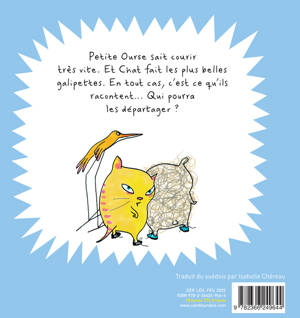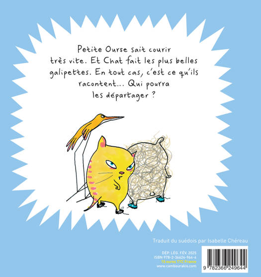 Petite Ourse sait courir très vite. Et Chat fait les plus belles galipettes. En tout cas, c'est ce qu'ils racontent... Qui pourra les départager ?