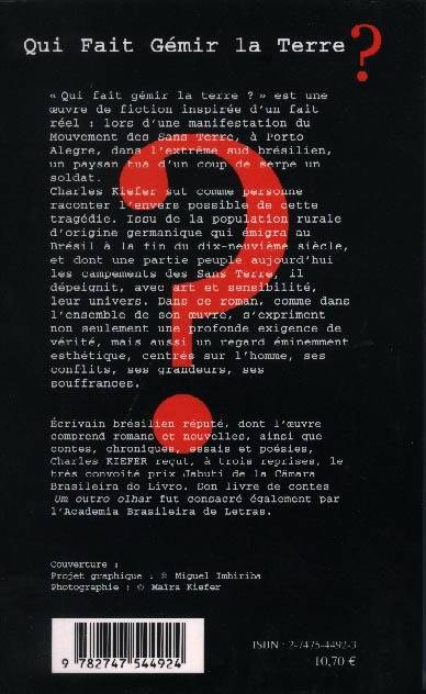 Lors d'une manifestation du Mouvement des Sans Terre, à Porto Alegre, un paysan tua d'un coup de serpe un soldat. Charles Kiefer sut comme personne raconter l'envers possible de cette tragédie. Issu de la population rurale d'origine germanique qui émigra au Brésil à la fin du dix-neuvième siècle, et dont une partie peuple aujourd'hui les campements des Sans Terre, il dépeignit, avec art et sensibilité, mais aussi un regard éminemment esthétique, leur univers.