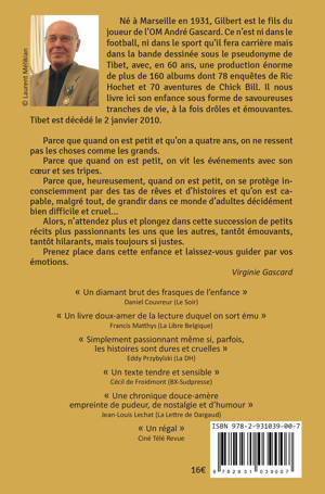 Quand le petit Gilbert quitte Marseille, sa ville natale, et arrive en Belgique, il n’a que quatre ans. Il s’installe avec sa maman, ses deux frères et sa sœur dans une petite ville près de la frontière française. Ce déménagement est censé calmer les crises de sa mère, qui a une phobie maladive de Marseille et de tout ce qui en provient. Les enfants se voient ainsi séparés de leur papa, joueur de l’Olympique de Marseille et propriétaire d’un magasin de sport. Tandis que la maman et la fille logent dans une pension de famille, les garçons goûtent aux joies de l’internat. Le petit Tibet découvre la vie dans ce sordide pensionnat. Il ne quittera que trois ans plus tard pour Bruxelles, la ville aux cent vingt cinémas. Il y fera les quatre cents coups avec ses frères et ses amis, chez les louveteaux et les scouts. Plus doué en dessin que dans les études, il y rencontrera Hergé qui lui prodiguera gentiment quelques conseils. Il y débutera également sa carrière aux côtés d’un certain André-Paul Duchâteau avec qui il travaillera pendant soixante ans.