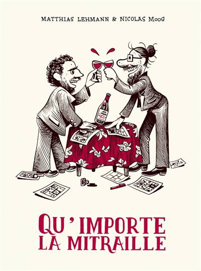 Avec Qu’importe la mitraille, opus tourmenté réalisé à quatre mains, Matthias Lehmann et Nicolas Moog nous montrent toute l’étendue de la complicité, dans l’adversité, de deux auteurs emblématiques de la bande dessinée alternative. Ils décryptent l’ensemble de leurs parcours artistique et le monde de l’édition dite alternative, des années 1990 à aujourd’hui, à travers des remémorations fragmentées en courts récits. Et c’est à la fois triste et pas triste. Dans la lignée du livre de Tanx, Des croûtes aux coins des yeux, ils questionnent la réalité de façon outrancière et impudique, causent de la réalité sociale du travail et constatent leurs statuts de losers de l’art. L’humour est grinçant, les crocs-en-jambe fatals et le désespoir noyé dans des flots d’alcool.En filigrane de leur vies et de leurs travaux, cette correspondance graphique étalée sur plus de 10 ans, regroupe des récits parus dans diverses revues, ou inédits, sur lesquels ils mélangent, dans toutes les combinaisons possibles dessins, écritures et encrages.On pourra faire un parallèle avec Les professionnels de Carlos Gimenez, qui apparait en clin d’œil dans deux histoires, tant Matthias Lehmann et Nicolas Moog centrent ce débat sur le rôle et l’aventure du métier d’auteur, offrant une version actuelle aux questionnements qui en découlent. Beaucoup d’hommages sont au rendez-vous de ces petites histoires (Clowes, Tillieux, Chaland, Franquin...), les auteurs explorant à foison leurs sources d’inspiration afin de mieux saisir les origines de leur engagement.