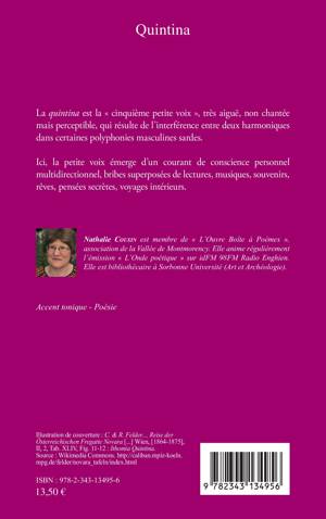 La Quintina est la "cinquième petite voix", très aiguë, non chantée mais perceptible, qui résulte de l'interférence entre deux harmoniques dans certaines polyphonies masculines sardes. Ici la petite voix émerge d'un courant de conscience personnel multidirectionnel, bribes superposées de lectures, musiques, souvenirs, rêves, pensées secrètes, voyages intérieurs.