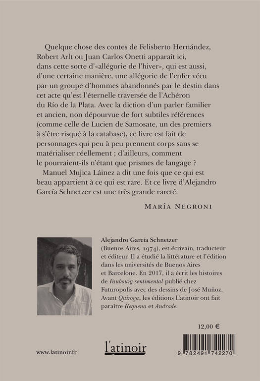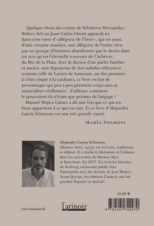 Quelque chose des contes de Felisberto Hernández, Robert Arlt ou Juan Carlos Onetti apparaît ici, dans cette sorte d'allégorie de l'hiver, qui est aussi, d'une certaine manière, une allégorie de l'enfer vécu par un groupe d'hommes abandonnés par le destin dans cet acte qu'est l'éternelle traversée de l'Achéron du Río de la Plata. Dan une deuxième partie, des textes critiques complètent le livre et commentent les 3 ouvrages Requena et Andrade du même auteur parus en 2021.
