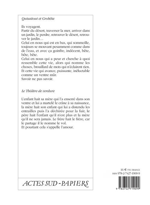 Ils voyagent. Partir du désert, traverser la mer, arriver dans un jardin, le perdre, retrouver le désert, retrouver le jardin... Celui en nous qui est en bas, qui sommeille, toujours se mouvant pesamment comme dans de l'eau, et avec ça goinfre, indécent, bête, bête, bête. Celui en nous qui a peur et cherche à quoi ressemble cette vie, alors qui nomme les choses, brouillard de mots qui n'éclairent rien. Et cette vie qui avance, puissante, inéluctable comme un ventre mûr. Savoir ne pas savoir.