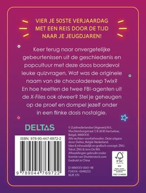Vier je 50ste verjaardag met deze unieke quizdoos vol vragen over je jeugdjaren en keer terug naar onvergetelijke gebeurtenissen uit de geschiedenis en popcultuur. Wat was de originele naam van de chocoladereep Twix? En hoe heetten de twee FBI-agenten uit de X-Filesook alweer? Stel je geheugen op de proef en dompel jezelf onder in een flinke dosis nostalgie. Doosje met 51 kaarten.