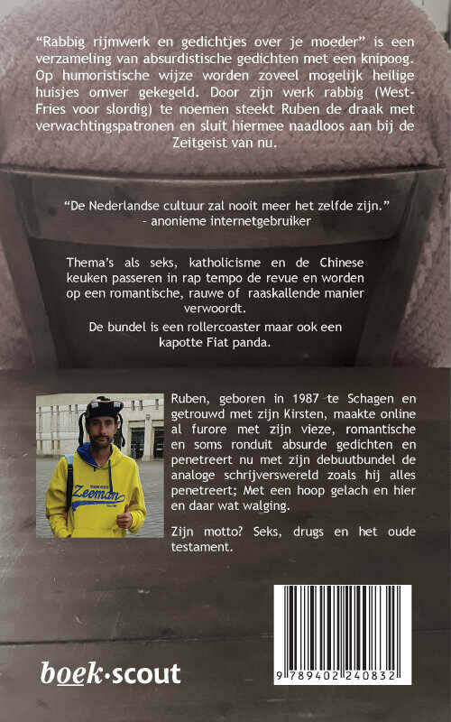 “Rabbig rijmwerk en gedichtjes over je moeder” is een verzameling van absurdistische gedichten met een knipoog. Op humoristische wijze worden zoveel mogelijk heilige huisjes omver gekegeld. Door zijn werk rabbig (West-Fries voor slordig) te noemen steekt Ruben de draak met verwachtingspatronen en sluit hiermee naadloos aan bij de Zeitgeist van nu.
