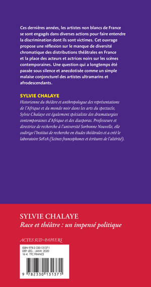 Ces dernières années, les artistes non blancs de France se sont engagés dans diverses actions pour faire entendre la discrimination dont ils sont victimes. Cet ouvrage propose une réflexion sur le manque de diversité chromatique des distributions théâtrales en France et la place des acteurs et actrices noirs sur les scènes contemporaines. Une question qui a longtemps été passée sous silence et anecdotisée comme un simple malaise conjoncturel des artistes ultramarins et afrodescendants.