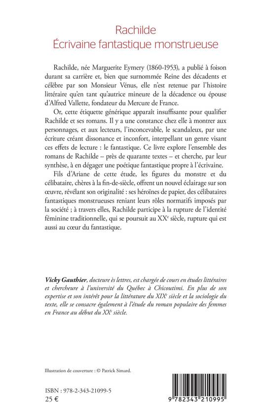 Rachilde, née Marguerite Eymery (1860-1953), a publié à foison durant sa carrière et, bien que surnommée Reine des décadents et célèbre par son Monsieur Vénus, elle n'est retenue par l'histoire littéraire qu'en tant qu'autrice mineure de la décadence ou épouse d'Alfred Vallette, fondateur du Mercure de France. Or, cette étiquette générique apparaît insuffisante pour qualifier Rachilde et ses romans. Ce livre explore l'ensemble des romans de Rachilde et cherche, par leur synthèse, à en dégager une poétique fantastique propre à l'écrivaine. Fils d'Ariane de cette étude, les figures du monstre et du célibataire, chères à la fin-de-siècle, offrent un nouvel éclairage sur son oeuvre, révélant son originalité ses héroïnes de papier, des célibataires fantastiques monstrueuses reniant leurs rôles normatifs imposés par la société; à travers elles, Rachilde participe à la rupture de l'identité féminine traditionnelle, qui se poursuit au XXe siècle, rupture qui est aussi au coeur du fantastique.