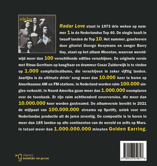 'Radar Love 50 jaar' is een biografie over de ultimate drivin’ song in woord, beeld en geluid. In zijn soort uniek voor Nederland, misschien zelfs een wereldprimeur. Een gedetailleerde reconstructie van de geboorte van deze Golden Earring klassieker. Een beeldverslag van 50 jaar gebruik in commercials, films, televisieseries en meer dan achthonderd coverversies tot en met het creatieve misbruik in de branding van allerlei consumentenproducten. Een musthave voor iedere muziekliefhebber en Earring fan.