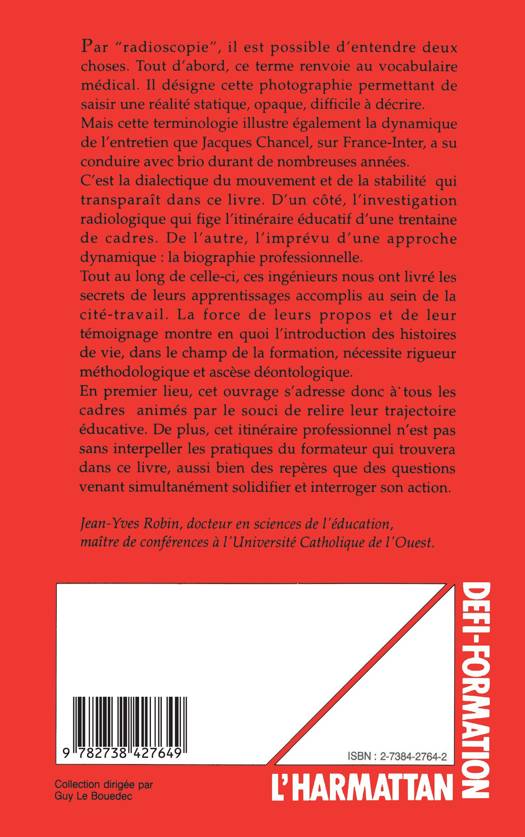 C'est la dialectique du mouvement et de la stabilité qui transparaît dans ce livre. D'un côté l'investigation radiologique fige l'itinéraire éducatif d'une trentaine de cadres. De l'autre, l'imprévu d'une approche dynamique: la biographie professionnelle. Des ingénieurs nous ont livré ainsi les secrets de leurs apprentissages et la force de leurs témoignages montre en quoi l'introduction des histoires de vie dans le champ de la formation nécessite rigueur méthodologique et ascèse déontologique;