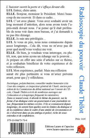 Claude Thélot, sociologue, a fréquenté les ministères pendant de nombreuses années et il en connait bien les coulisses. Dans ce nouvel essai, il aborde le thème du pouvoir, sur la forme d’un dialogue entre un gouvernant et une journaliste en vue, fréquentant les mêmes cercles. S’ils se connaissent depuis longtemps, ils savent bien quelles sont les limites du dialogue et de la confidence dans le cadre d’une amitié de circonstances et ils s’observent dans un jeu ambigu et policé, riche de sous-entendus et de confidences. Le pouvoir et ses avantages, ses privilèges, ses contraintes, une carrière ou une étape : invitons-nous dans un palais ministériel à l'heure du déjeuner.