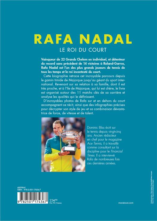 Vainqueur de 22 Grands Chelem en individuel, et détenteur du record sans précédent de 14 victoires à Roland-Garros, Rafa Nadal est l’un des plus grands joueurs de tennis de tous les temps et le roi incontesté du court. Cette biographie retrace cet incroyable parcours depuis le gamin timide de Majorque jusqu’au géant du sport international. Revenant sur sa relation à sa famille, dont il est très proche, et à l’île de Majorque, qui lui est chère, le livre est organisé autour des 11 matchs clés de sa carrière et analyse les qualités qui le définissent. D’incroyables photos de Rafa sur et en dehors du court accompagnent ce récit, ainsi que des infographies précises pour décrypter son style de jeu et sa combinaison dévastatrice de force, de vitesse et de talent.