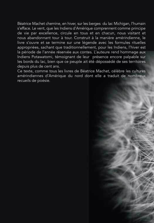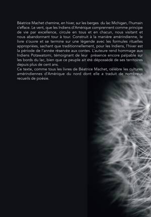 Béatrice Machet chemine, en hiver, sur les berges du lac Michigan, l’humain s’efface. Le vent, que les Indiens d’Amérique comprennent comme principe de vie par excellence, circule en tous et en chacun, nous visitant et nous abandonnant tour à tour. Construit à la manière amérindienne, le livre s’ouvre et se termine sur une légende avec les formules rituelles appropriées, sachant que traditionnellement, pour les Indiens, l’hiver est la période de l’année réservée aux contes. L’auteure rend hommage aux Indiens Potawatomi, témoignant de leur présence encore palpable sur les bords du lac, bien que ce peuple ait été dépossédé de ses territoires depuis plus de cent ans.<br /> Ce texte, comme tous les livres de Béatrice Machet, célèbre les cultures amérindiennes d’Amérique du nord dont elle a traduit de nombreux recueils de poésie.