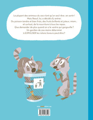 La plupart des animaux du zoo n'ont qu'un seul rêve: en sortir! Mais Raoul, lui, a décidé d'y entrer. Du poisson tendre et bien frais, des fruits brillants et juteux, miam... et surtout, de la nourriture à tous les repas. Que demander de plus quand on a le ventre qui gargouille? Un gardien de zoo moins déterminé à EXPULSER les ratons laveurs peut-être?