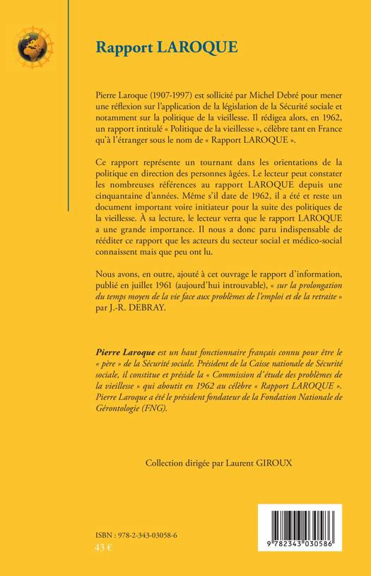 Le rapport Laroque représente un tournant dans les orientations de la politique en direction des personnes âgées. Il nous a donc paru indispensable de rééditer ce rapport que les acteurs du secteur social et médico-social connaissent mais que peu ont lu. Nous avons, en outre, ajouté à cet ouvrage le rapport d'information, publié en juillet 1961 (aujourd'hui introuvable), « sur la prolongation du temps moyen de la vie face aux problèmes de l'emploi et de la retraite » par J.-R. Debray.