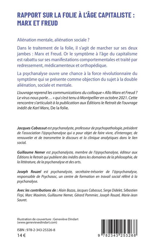 Aliénation mentale, aliénation sociale ? Dans le traitement de la folie, il s'agit de marcher sur ses deux jambes : Marx et Freud. Or le symptôme à l'âge du capitalisme est rabattu sur ses manifestations comportementales et traité par redressement, médicamenteux et orthopédique. La psychanalyse ouvre une chance à la force révolutionnaire du symptôme qui se présente comme objection du sujet à la double aliénation, sociale et mentale. L'ouvrage reprend les communications du colloque « Allo Marx et Freud ? Le virus nous parle... » qui s'est tenu à Montpellier en octobre 2021. Cette rencontre s'articulait à la publication aux Éditions le Retrait de l'ouvrage inédit de Karl Marx, De la folie.