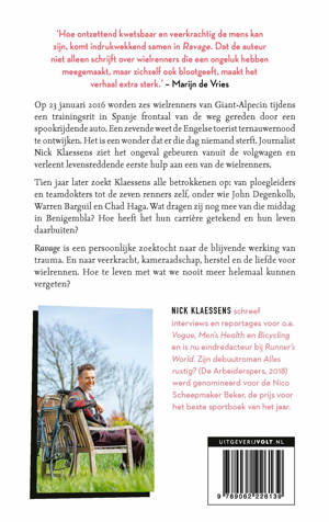 ‘Hoe ontzettend kwetsbaar en veerkrachtig de mens kan zijn, komt indrukwekkend samen in Ravage. Dat de auteur niet alleen schrijft over wielrenners die een ongeluk hebben meegemaakt, maar zichzelf ook blootgeeft, maakt het verhaal extra sterk.’ – Marijn de Vries