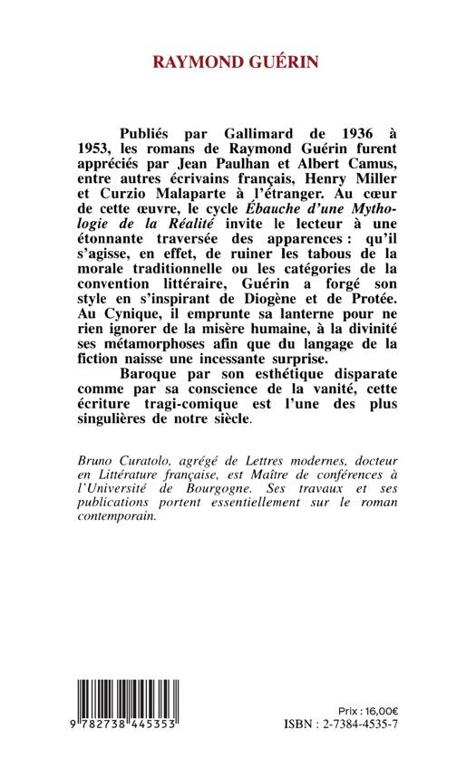 Publiés par Gallimard de 1936 à 1953, les romans de Raymond Guérin furent appréciés par Jean Paulhan et Albert Camus, entre autres écrivains français, Henry Miller et Curzio Malaparte à l’étranger. Au cœur de cette œuvre, le cycle Ébauche d’une mythologie de la Réalité invite le lecteur à une étonnante traversée des apparences : qu’il s’agisse, en effet, de ruiner les tabous de la morale traditionnelle ou les catégories de la convention littéraire, Guérin a forgé son style en s’inspirant de Dostoïevski et de Proust. Au Cynique, il emprunte sa lanterne pour ne rien ignorer de la misère humaine, à la divinité ses métamorphoses afin de du langage de la fiction naisse une incessante surprise.