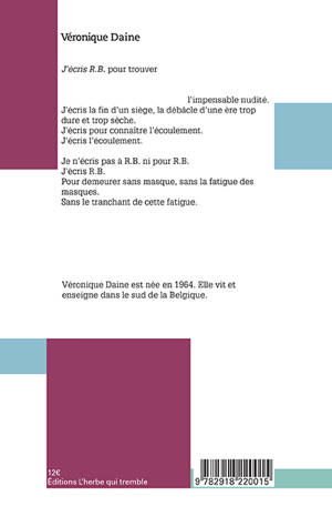Le recueil est constitué de deux parties : « Petite Suite de l’incendie et de la dévoration » et « R.B. » Dans « Petite Suite de l’incendie et de la dévoration », sept poèmes se suivent et se répondent, petite suite qui va de matin en matin pour déboucher sur le dernier poème « Et puis la nuit ». Entre-temps a eu lieu l’incendie de la dévoration. « C’est quelque chose à l’intérieur de moi, explique l’auteur, qui me donne l’impression d’être dévorée. L’incendie de la dévoration, c’est accepter de céder à ce qui dévore, et je le dis par l’écriture et la poésie. » « R.B., ce sont les initiales d’une femme qui m’a bouleversée par la manière dont elle vivait un deuil. J’ai réalisé combien j’aime les femmes, combien ce qu’elles vivent me touche. Toutes les femmes que je connais contribuent à ce que je suis. R.B. m’a donné à toucher cette présence. »