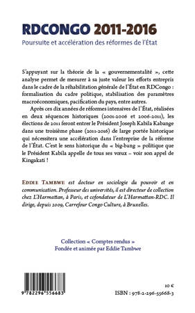 S'appuyant sur la théorie de la "gouvernementalité", cette analyse permet de mesurer les efforts entrepris dans le cadre de la réhabilitation générale de l'Etat en RDC : formalisation du cadre politique, stabilisation des paramètres macroéconomiques, pacification du pays, entre autres.