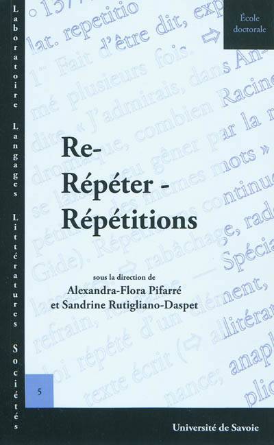 C'est donc sur cette place à la fois contestée et incontestable de la répétition qu'on été organisées en avril 2007 les Journées d'études doctorales du Laboratoire LLS, ouvrant les champs de recherche sur la répétition à la pluridisciplinarité et dont cet ouvrage se fait l'écho aujourd'hui.