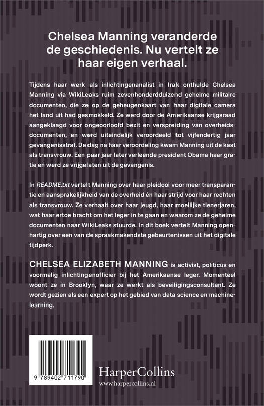 In README.txt vertelt Manning over haar pleidooi voor meer transparantie en aansprakelijkheid van de overheid én haar strijd voor haar rechten als transvrouw. Ze verhaalt over haar jeugd, haar moeilijke tienerjaren en wat haar ertoe bracht om het leger in te gaan. Ook vertelt ze hoe en waarom ze de beslissing nam om de geheime documenten naar WikiLeaks te sturen. Dit openhartige boek zal zijn plek vinden in de geschiedenis van ons huidige digitale tijdperk.