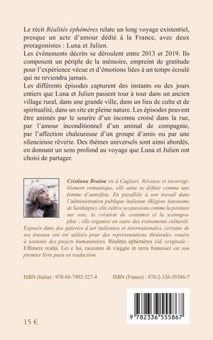 Le récit Réalités éphémères relate un long voyage existentiel, presque un acte d'amour dédié à la France, avec deux protagonistes: Luna et Julien. Les événements décrits se déroulent entre 2013 et 2019. Ils composent un périple de la mémoire, empreint de gratitude pour l'expérience vécue et d'émotions liées à un temps écoulé qui ne reviendra jamais. Les différents épisodes capturent des instants ou des jours entiers que Luna et Julien passent tour à tour dans un ancien village rural, dans une grande ville, dans un lieu de culte et de spiritualité, dans un site en pleine nature. Les épisodes peuvent être animés par le sourire d'un inconnu croisé dans la rue, par l'amour inconditionnel d'un animal de compagnie, par l'affection chaleureuse d'un groupe d'amis ou par une silencieuse rêverie. Des thèmes universels sont ainsi abordés, en donnant un sens profond au voyage que Luna et Julien ont choisi de partager.