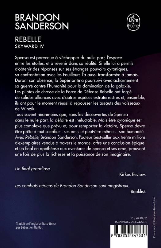 Spensa est parvenue à s’échapper du nulle part, l’espace entre les étoiles, et à revenir dans sa réalité. Sa confrontation avec les Fouilleurs, si elle lui a permis d’obtenir les réponses aux questions qu’elle se posait sur ses étranges pouvoirs cytoniques, l’a aussi transformée à jamais. Durant son absence, la Supériorité a poursuivi avec acharnement sa guerre contre l’humanité pour la domination de la galaxie. Les pilotes de chasse de la Force de Défense Rebelle ont forgé de solides alliances avec d’autres espèces extraterrestres et, ensemble, ils ont pour le moment réussi à repousser les assauts des vaisseaux de Winzik. Tous savent néanmoins que, sans les découvertes de Spensa dans le nulle part, la défaite est inéluctable. Mais être cytonique est plus complexe que prévu et, pour remporter la victoire, Spensa devra être prête à tout sacrifier : ses amis et peut-être même... son humanité. Avec Rebelle, Brandon Sanderson, l’auteur best-seller aux trente millions d’exemplaires vendus à travers le monde, offre une conclusion épique et un final en apothéose aux aventures de Spensa et ses amis, prouvant une fois de plus la richesse et la puissance de son imaginaire.