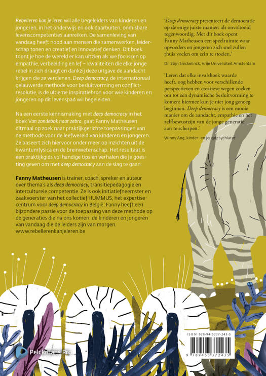 wil alle begeleiders van kinderen en jongeren, in het onderwijs en ook daarbuiten, onmisbare levenscompetenties aanreiken. De samenleving van vandaag heeft nood aan mensen die samenwerken, leiderschap tonen en creatief en innovatief denken. Dit boek toont je hoe de wereld er kan uitzien als we focussen op empathie, verbeelding en lef – kwaliteiten die elke jonge rebel in zich draagt en dankzij deze uitgave de aandacht krijgen die ze verdienen. Deep democracy, de internationaal gelauwerde methode voor besluitvorming en conflictresolutie, is de ultieme inspiratiebron voor wie kinderen en jongeren op dit levenspad wil begeleiden.Na een eerste kennismaking met deep democracy in het boek Van zondebok naar zebra, gaat Fanny Matheusen ditmaal op zoek naar praktijkgerichte toepassingen van de methode voor de leefwereld van kinderen en jongeren. Ze baseert zich hiervoor onder meer op inzichten uit de kwantumfysica en de breinwetenschap. Het resultaat is een praktijkgids vol handige tips en verhalen die je goesting geven om met deep democracy aan de slag te gaan.