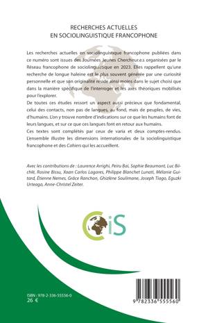 Les recherches actuelles en sociolinguistique francophone publiées dans ce numéro sont issues des Journées Jeunes Chercheur.e.s organisées par le Réseau francophone de sociolinguistique en 2023. Elles rappellent qu'une recherche de longue haleine est le plus souvent générée par une curiosité personnelle et que son originalité réside ainsi moins dans le sujet choisi que dans la manière spécifique de l'interroger et les axes théoriques mobilisés pour l'explorer. De toutes ces études ressort un aspect aussi précieux que fondamental, celui des contacts, non pas de langues, au fond, mais de peuples, de vies, d'humains. L'on y trouve nombre d'indications sur ce que les humains font de leurs langues, et sur ce que ces langues font en retour aux humains. Ces textes sont complétés par ceux de varia et deux comptes-rendus. L'ensemble illustre les dimensions internationales de la sociolinguistique francophone et des Cahiers qui les accueillent.