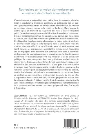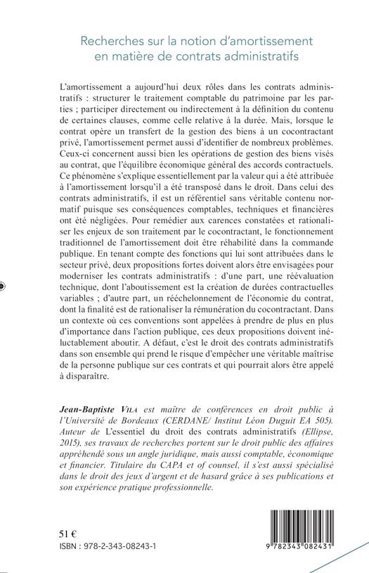 L'amortissement en droit des contrats administratifs a deux fonctions. La première, comptable, permet de répertorier les pertes de valeurs affectant le patrimoine. L'autre est fiscale/financière et a vocation à permettre la compensation d'une perte prévisible, pour le cocontractant. L'ouvrage envisage les règles applicables à ces deux mécanismes appliqués aux contrats administratifs, en particulier aux délégations de services publics, tout en formulant deux propositions fortes : la construction de durées contractuelles variables et la rationalisation de l'équilibre économique de ces contrats.