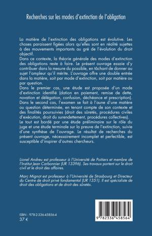La matière de l'extinction des obligations est évolutive. Les choses paraissent figées alors qu'elles sont en réalité sujettes à des mouvements importants au gré de l'évolution du droit objectif. Dans ce contexte, la théorie générale des modes d'extinction des obligations reste à faire. Le présent ouvrage essaie d'y contribuer dans la mesure du possible, en tâchant de donner au sujet l'ampleur qu'il mérite. L'ouvrage offre une double entrée dans la matière, soit par mode d'extinction, soit par matière ou par question. Dans le premier cas, une étude est proposée d'un mode d'extinction identifié (dation en paiement, remise de dette, novation et délégation, confusion, déchéance et prescription). Dans le second cas, l'examen se fait à l'aune d'une matière ou question déterminée, en tenant compte de son contexte et des finalités poursuivies (droit des sûretés, procédures civiles d'exécution, droit du surendettement, procédures collectives). Le tout est bordé par une étude préliminaire sur le rôle du juge et une étude terminale sur la preuve de l'extinction, suivie d'une synthèse de l'ouvrage. Le résultat de recherches du présent ouvrage, nécessairement incomplet et perfectible, est susceptible d'inspirer d'autres chercheurs.