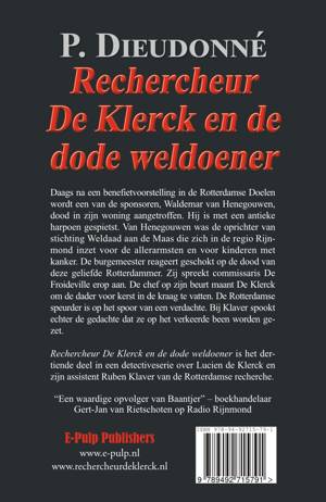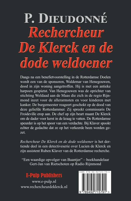 Rechercheur De Klerck en de dode weldoener is het dertiende deel in een detectiveserie over Lucien de Klerck en zijn assistent Ruben Klaver van de Rotterdamse recherche.