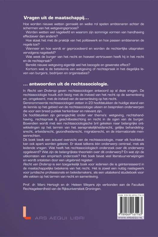 Een nuttig naslagwerk voor juristen, beleidsmakers en studenten die geïnteresseerd zijn in de, actuele, maatschappelijke betekenis van het recht beschreven door een aantal gerenommeerde rechtssociologen.