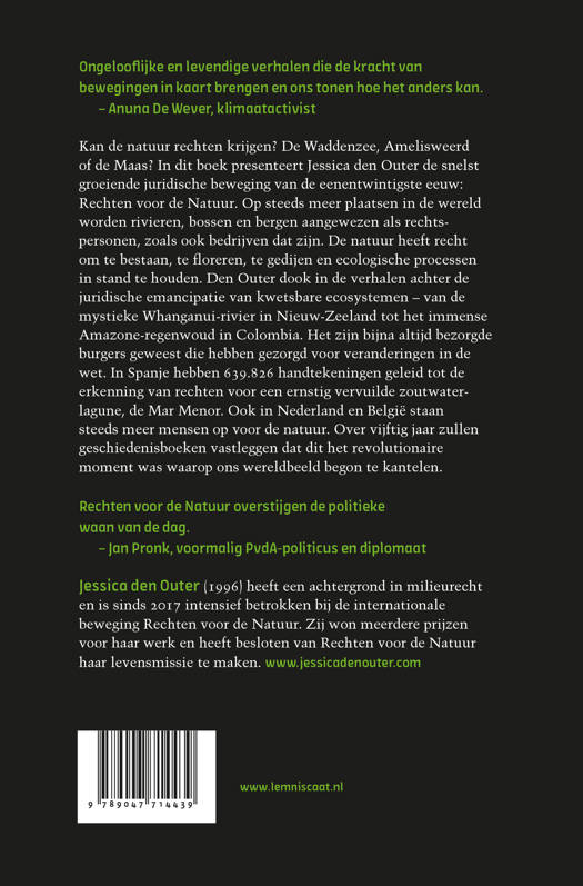 Kan de natuur rechten krijgen? De Waddenzee, Amelisweerd of de Maas? In dit boek presenteert Jessica den Outer de snelst groeiende juridische beweging van de eenentwintigste eeuw: Rechten voor de Natuur. Op steeds meer plaatsen in de wereld worden rivieren, bossen en bergen aangewezen als rechtspersonen, zoals ook bedrijven dat zijn. De natuur heeft recht om te bestaan, te floreren, te gedijen en ecologische processen in stand te houden. Den Outer dook in de verhalen achter de juridische emancipatie van kwetsbare ecosystemen in zeven landen – van de mystieke Whanganui-rivier in Nieuw-Zeeland tot het immense Amazone-regenwoud in Colombia. Het zijn bijna altijd bezorgde burgers geweest die hebben gezorgd voor veranderingen in de wet. In Spanje hebben 639.826 handtekeningen geleid tot de erkenning van rechten voor een ernstig vervuilde zoutwaterlagune, de Mar Menor. Ook in Nederland en België staan steeds meer mensen op voor de natuur. Over vijftig jaar zullen geschiedenisboeken vastleggen dat dit het revolutionaire moment was waarop ons wereldbeeld begon te kantelen.